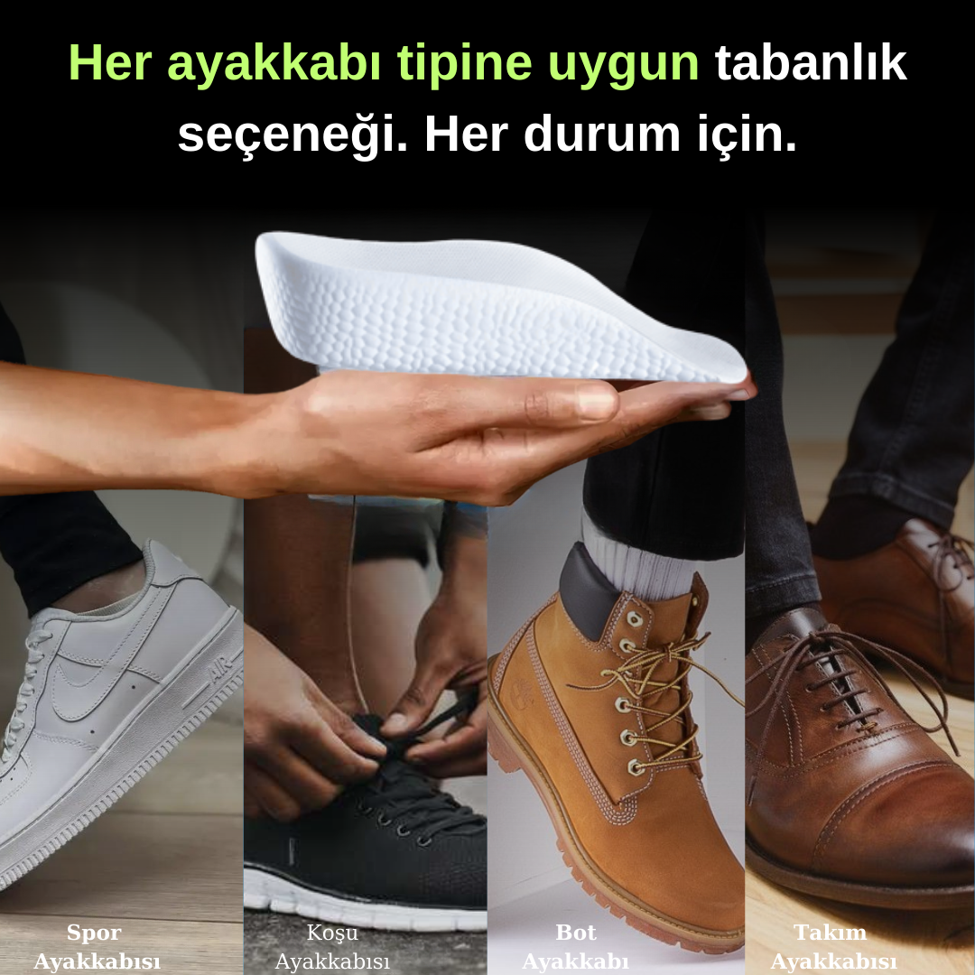Son teknoloji ortopedik tasarımı, her türlü durumda her ayakkabıya gizlice uymasını sağlarken, yüksekliği arttırır ve eklemlerinizi destekler.